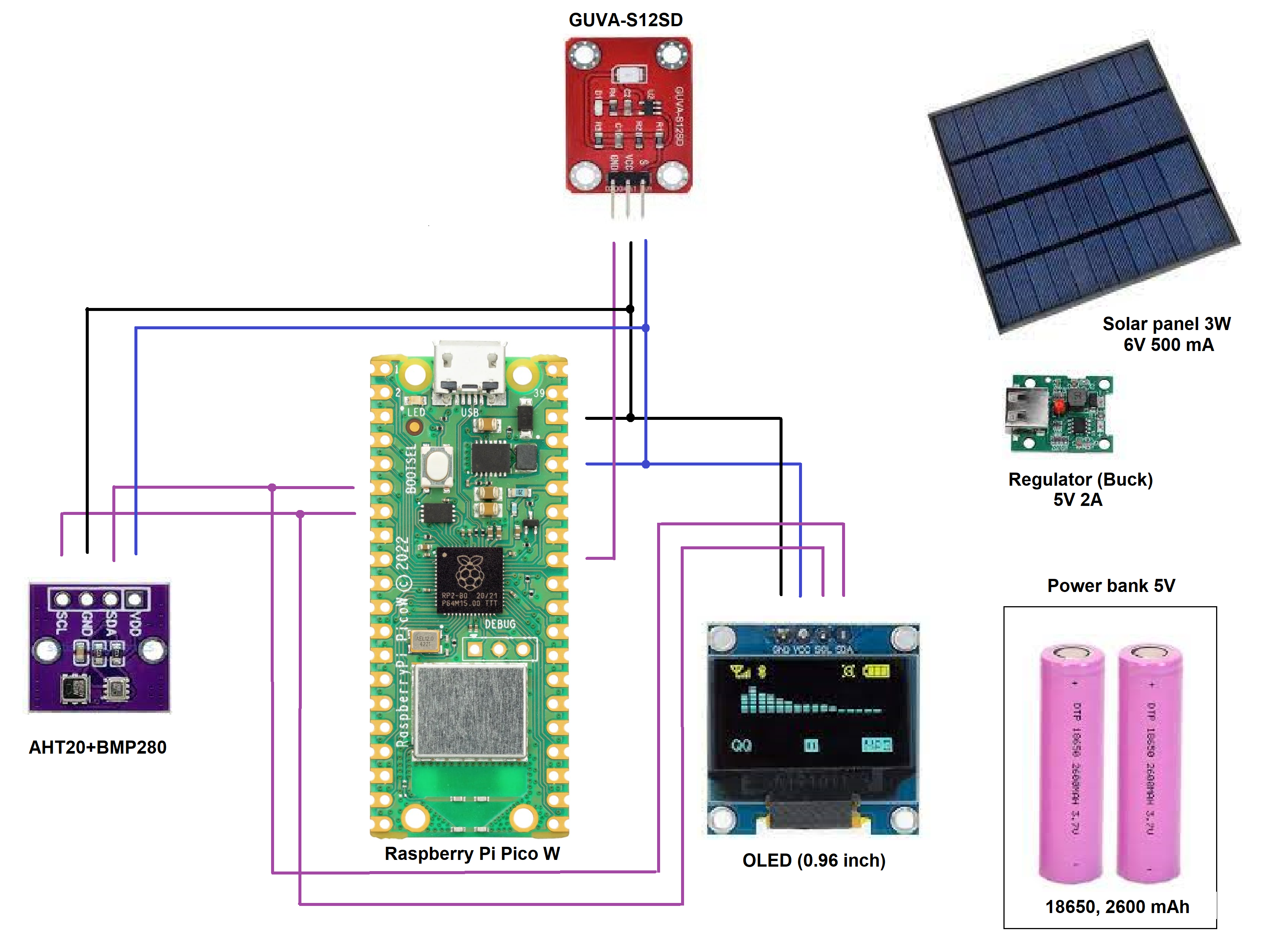 Consum total: 27 mA (Pico W) + 30 mA (OLED) + 1 mA (AHT20) + 0.3 mA (BMP280) + consum neglijabil (GUVA-S12SD) = aproximativ 58.3 mA la 3.3V.